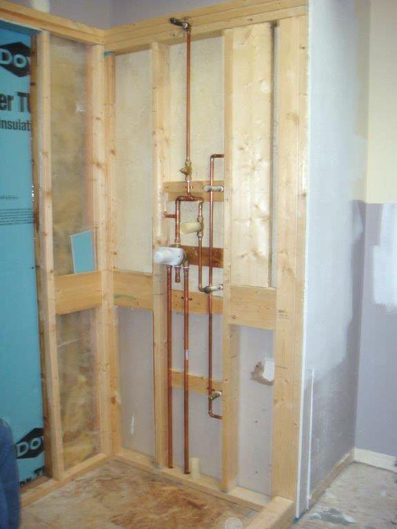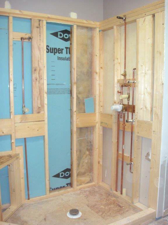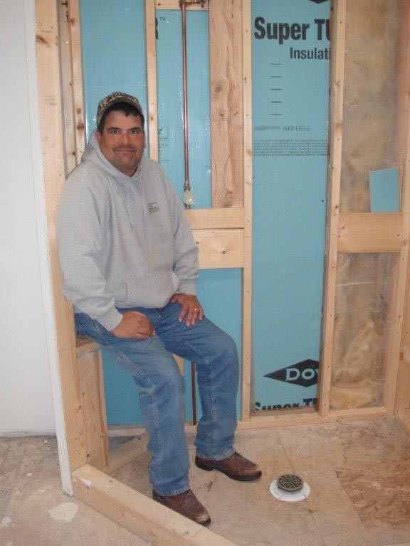 Interesting part of the story – take a look at the photos mid-construction. You’ll see Dan in the corner of the shower we designed. We thought it would be too small even for an average size guy. Our customer agreed so as you look thru the photos, you’ll see that we changed the layout of the shower to accommodate a little more room. A success for remote construction and a happy customer to boot!